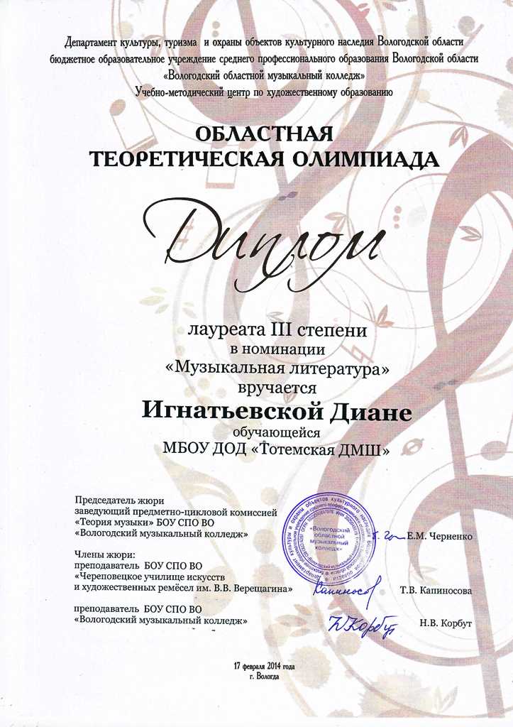 Учащаяся Тотемской детской музыкальной школы Диана Игнатьевская (преподаватель Ольга владимировна Русинова) приняла участие в номинации «Музыкальная литература». Конкурсные испытания состояли из письменного тура и проводились в следующих формах: